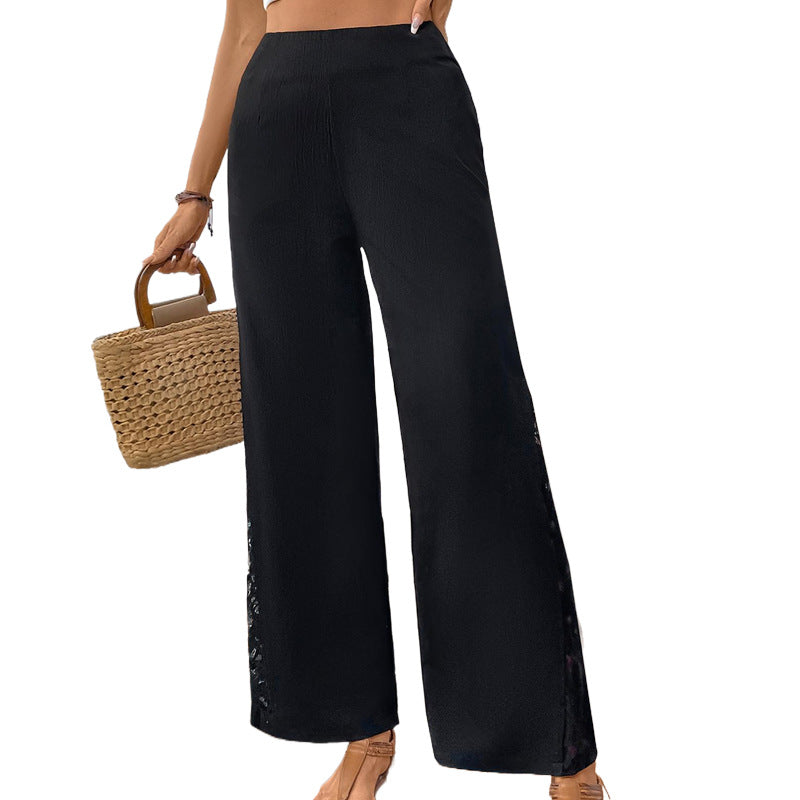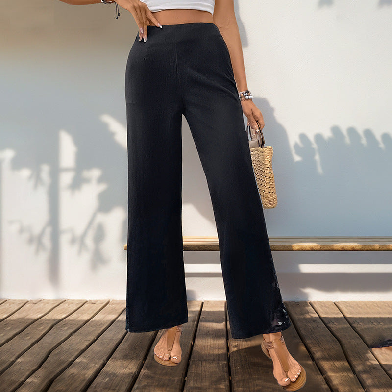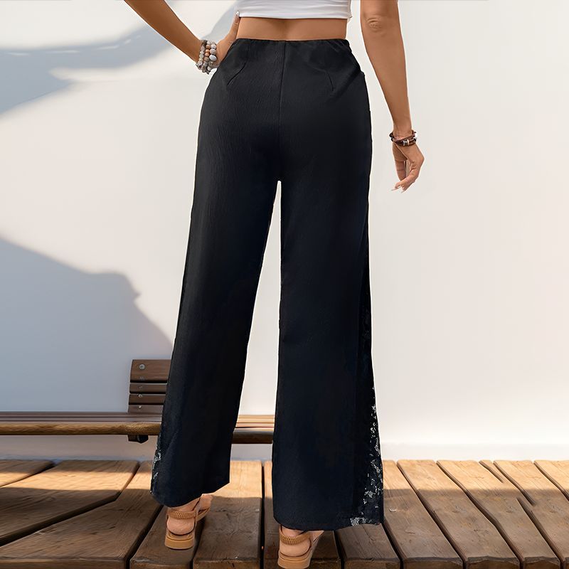 The standout feature is the delicate lace stitching along the side seams, adding a touch of feminine sophistication to a classic silhouette. Crafted from a breathable, lightweight fabric with a "crinkle" texture, they offer a relaxed drape that keeps you cool during rush hour and stylish at happy hour.